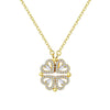 The necklace works with a magnet. You can wear the necklace like a four-leaf clover when you put the magnets together. When you pull these magnets apart, these clovers will unfold into four hearts.